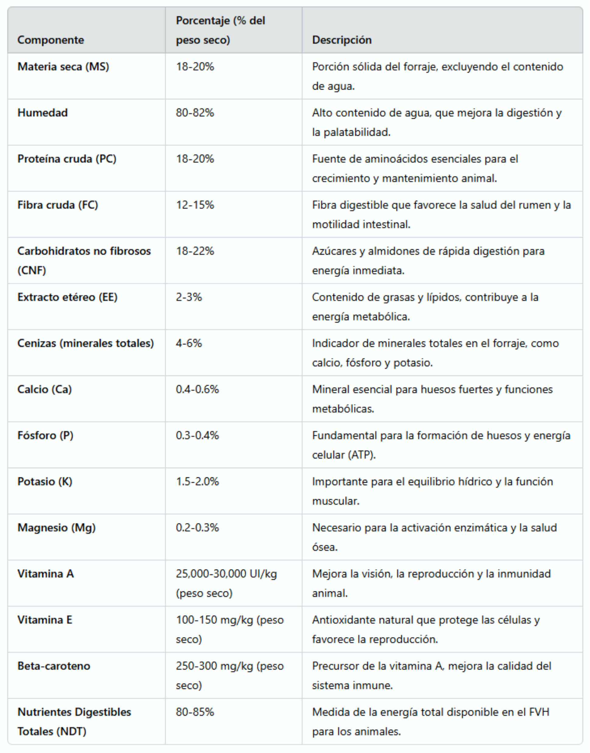 El valor de Nutrientes Digestibles Totales (NDT) refleja la cantidad de energía que los animales pueden extraer del forraje. Un NDT de 80-85% es excepcionalmente alto, lo que confirma que el FVH de trigo es una fuente altamente eficiente de energía y nutrientes, ideal para maximizar la producción de leche, carne y rendimiento físico en diversas especies.